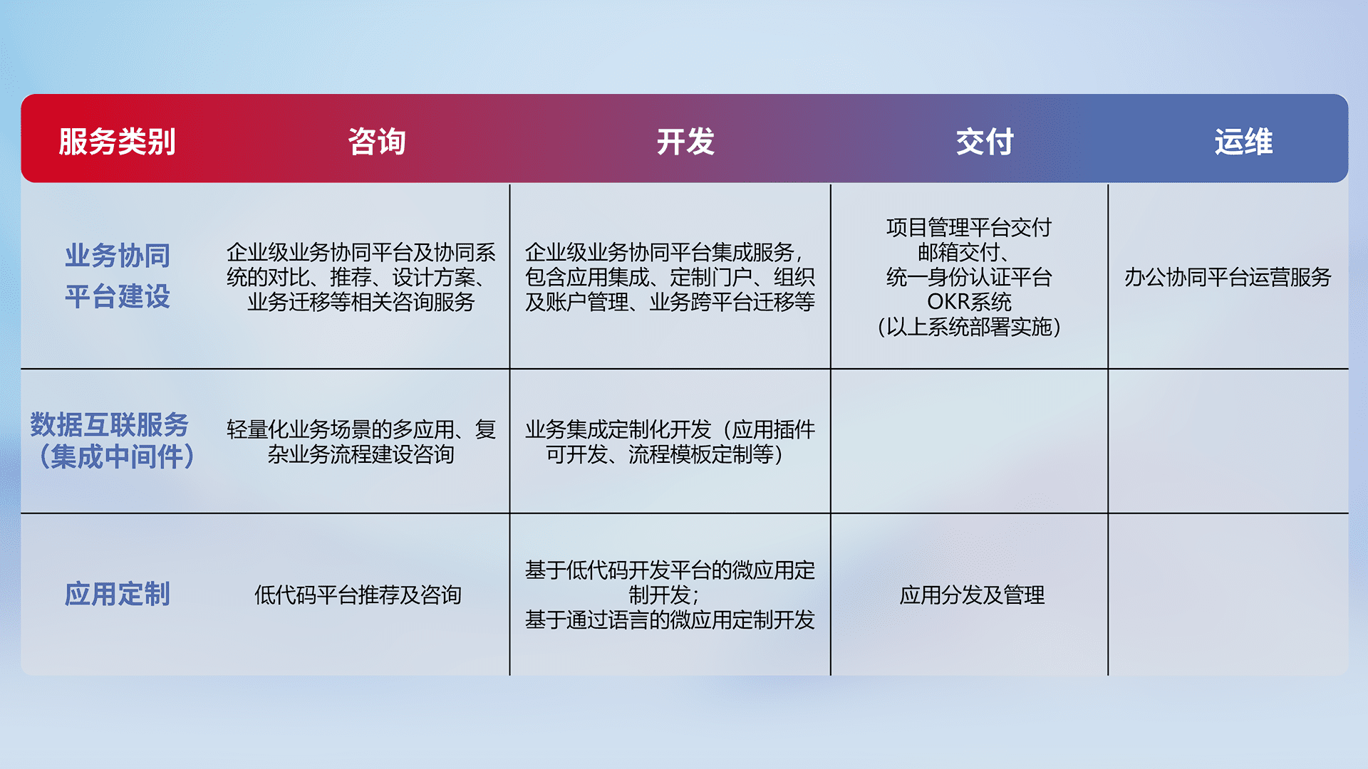 针对钉钉、、、企微、、IDaas等平台级产品提供产品的规划、、、、方案、、、交付、、定制化开发等服务,,,,实现如统一协同办公、、、、智能客户服务、、混合会议管理、、、智能数据查询、、等业务场景,,,实现数字化转型。。
