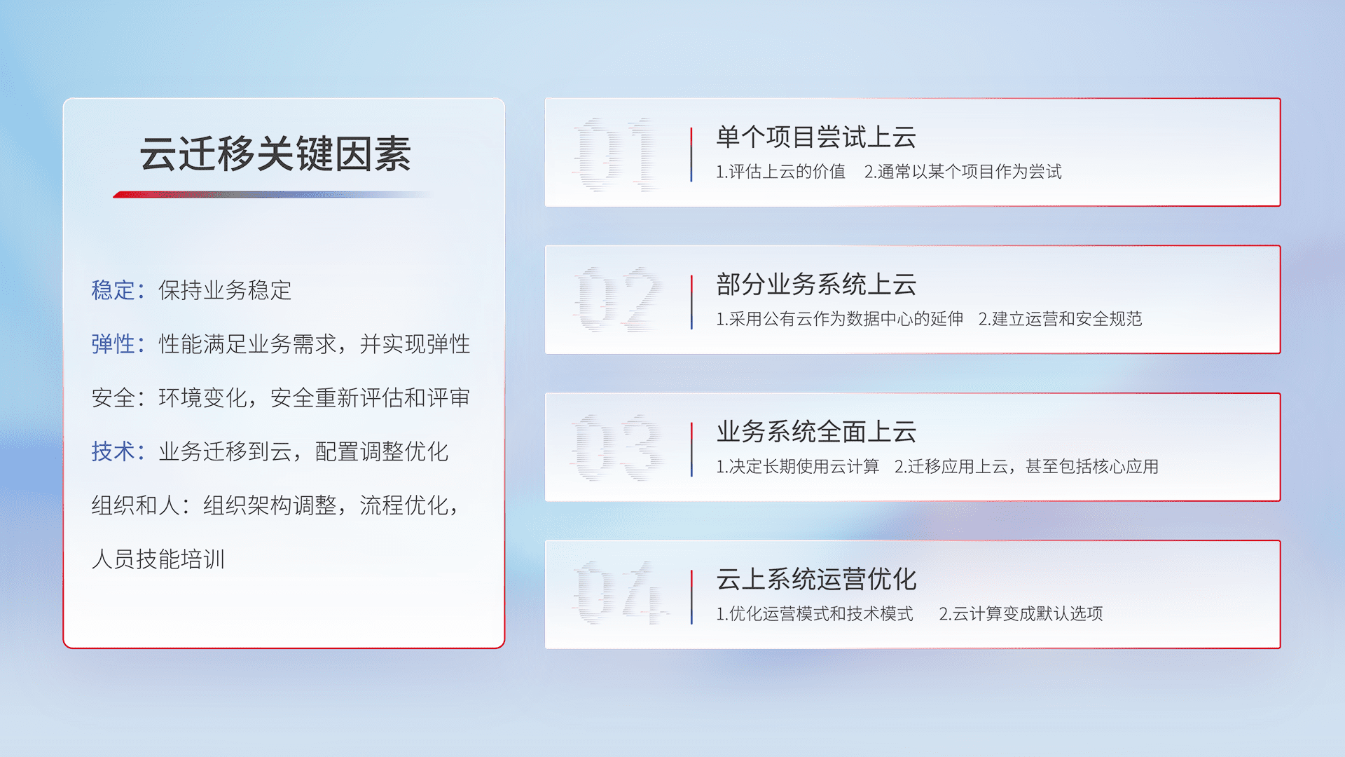 结合实际业务,,从规划设计、、、云平台选型、、、、云原生改造、、、、数据迁移、、集成交付,,,迁移全过程为客户识别最佳上云路径,,,做好风险识别管理,,,,设计网络架构、、、、身份权限、、、安全审计合规、、、、操作审计、、、、日志审计、、、监控告警策略、、、多站点容灾设计等,,,,对云上基础设施进行整体规划,,提升IT治理水平,,,以满足弹性、、、高可用、、、高性能的需求。。。
